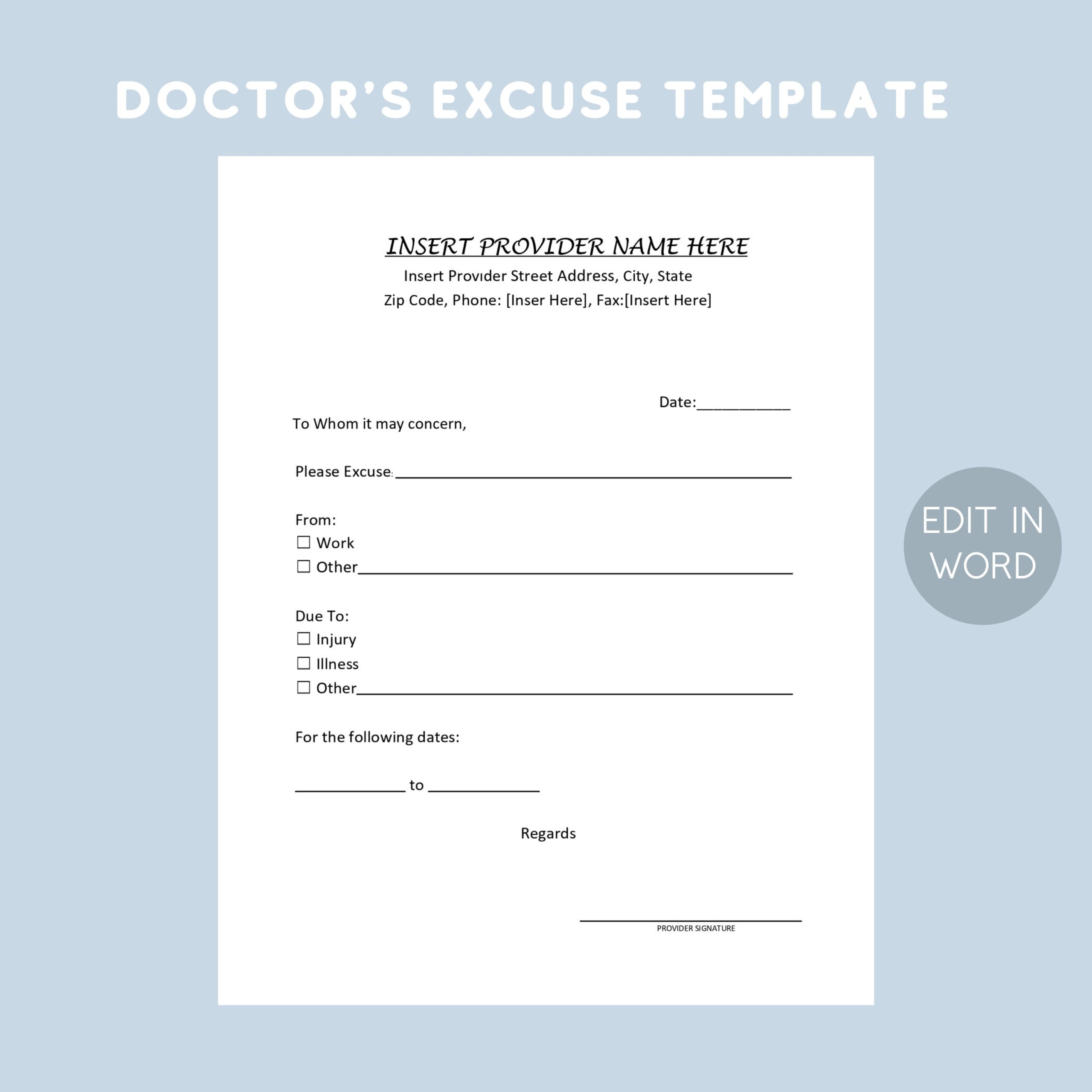 Printable Doctors Excuse Template EDITABLE Medical Office Forms Work Excuse Printable Digital Downloads School Excuse Note DOCX