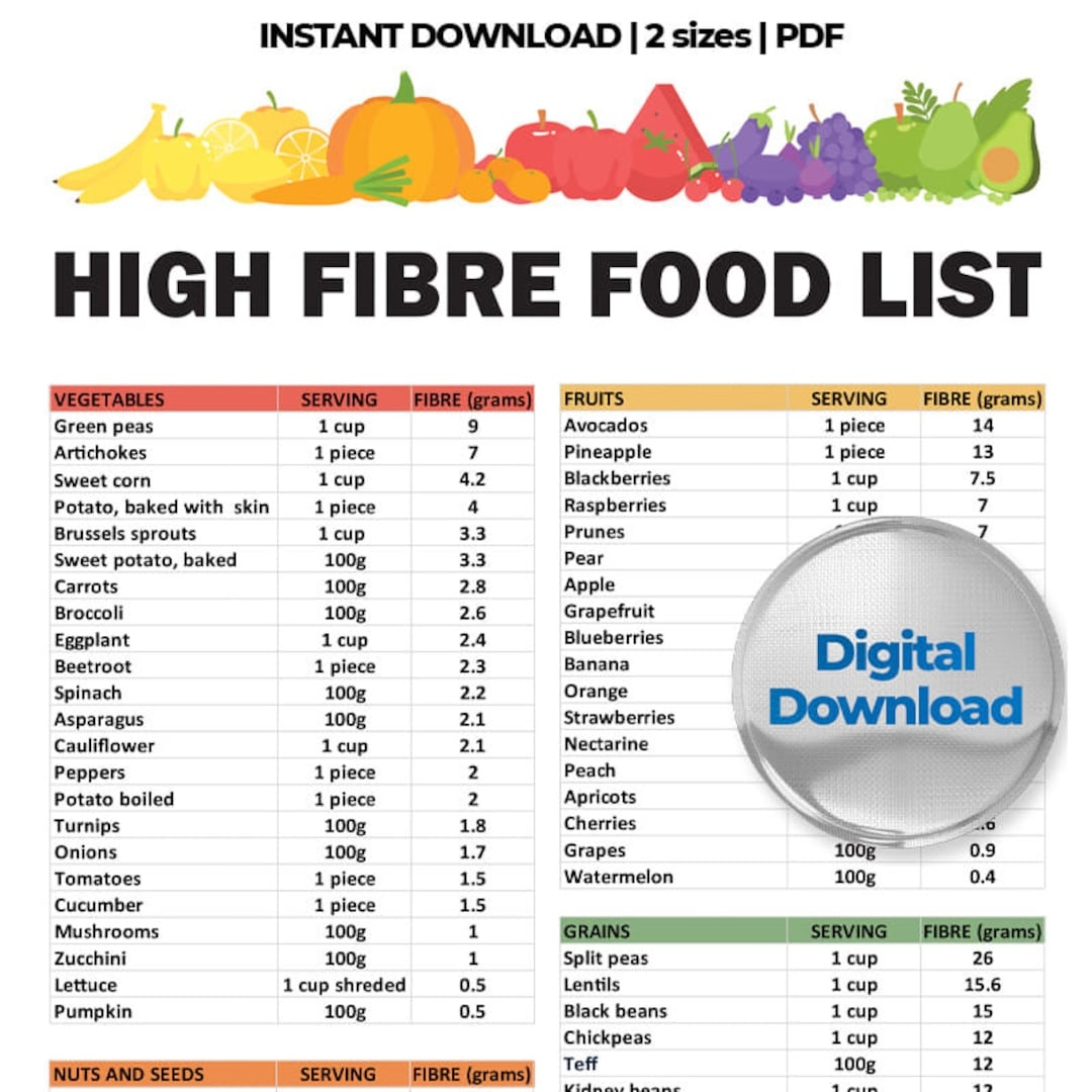 High Fiber Foods List High Fiber Food Chart Fiber Foods Guide High Fiber Meal Plan Fiber Nutrition List Low Carb Dietary Fiber Sources Etsy