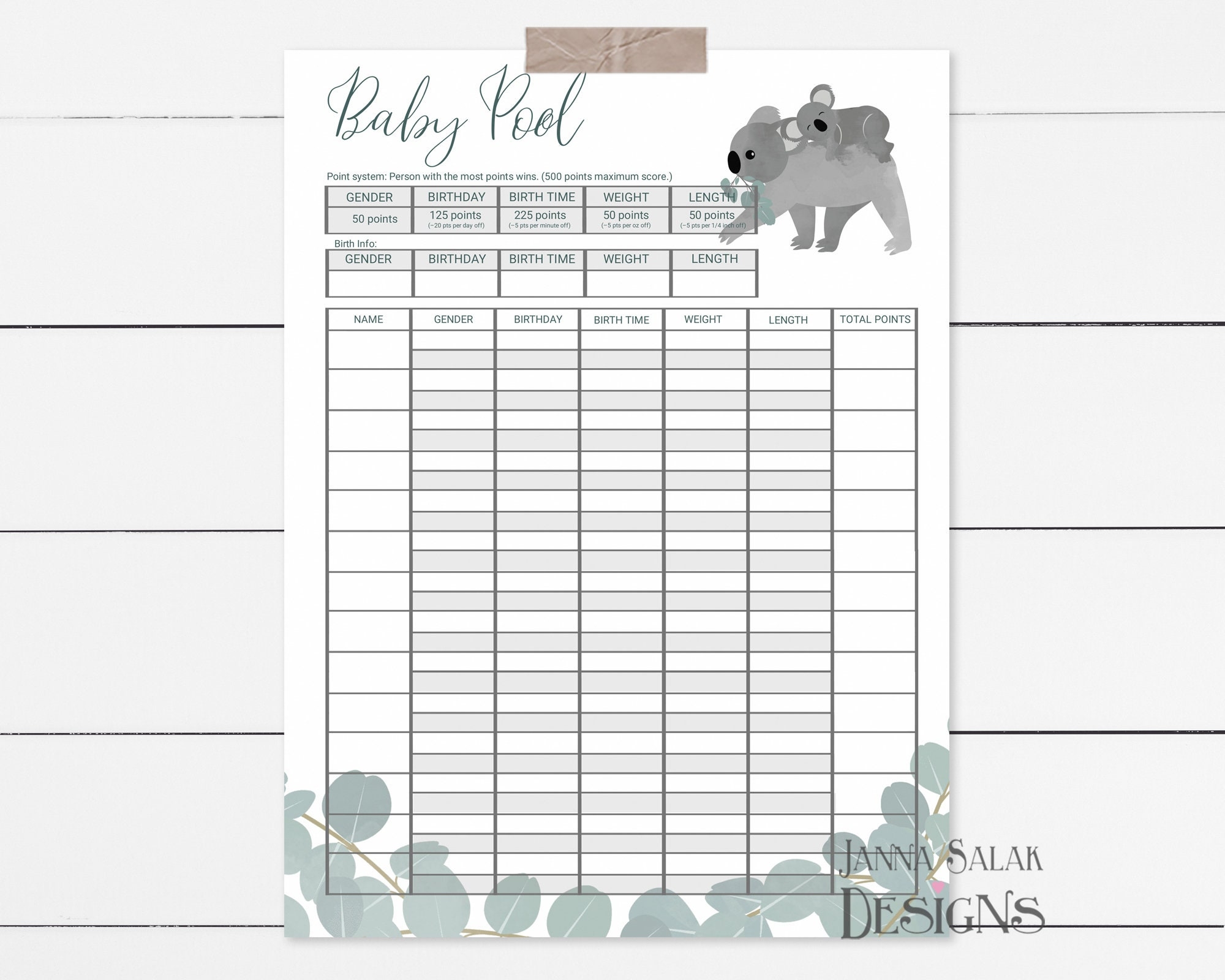 Koala Baby Pool Birth Prediction Printable Poster Sign Template Eucalyptus 11×17 18×24 24×36 diy With Editable Text KO01 Etsy