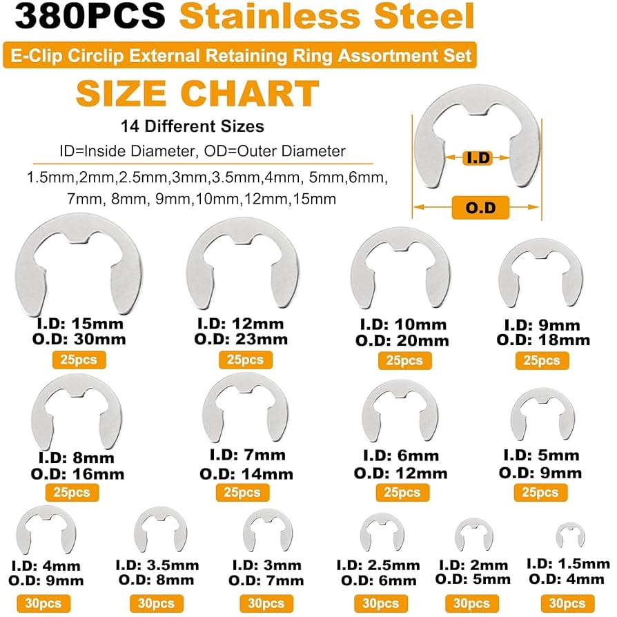 Stainless Steel Retaining Ring Assortment Toolly 380 Piece Stainless Steel E Clip Assortment 14 Sizes Metric Retaining Rings Kit With Storage Case Toolly 380pc Stainless Steel E clip Assortment Set
