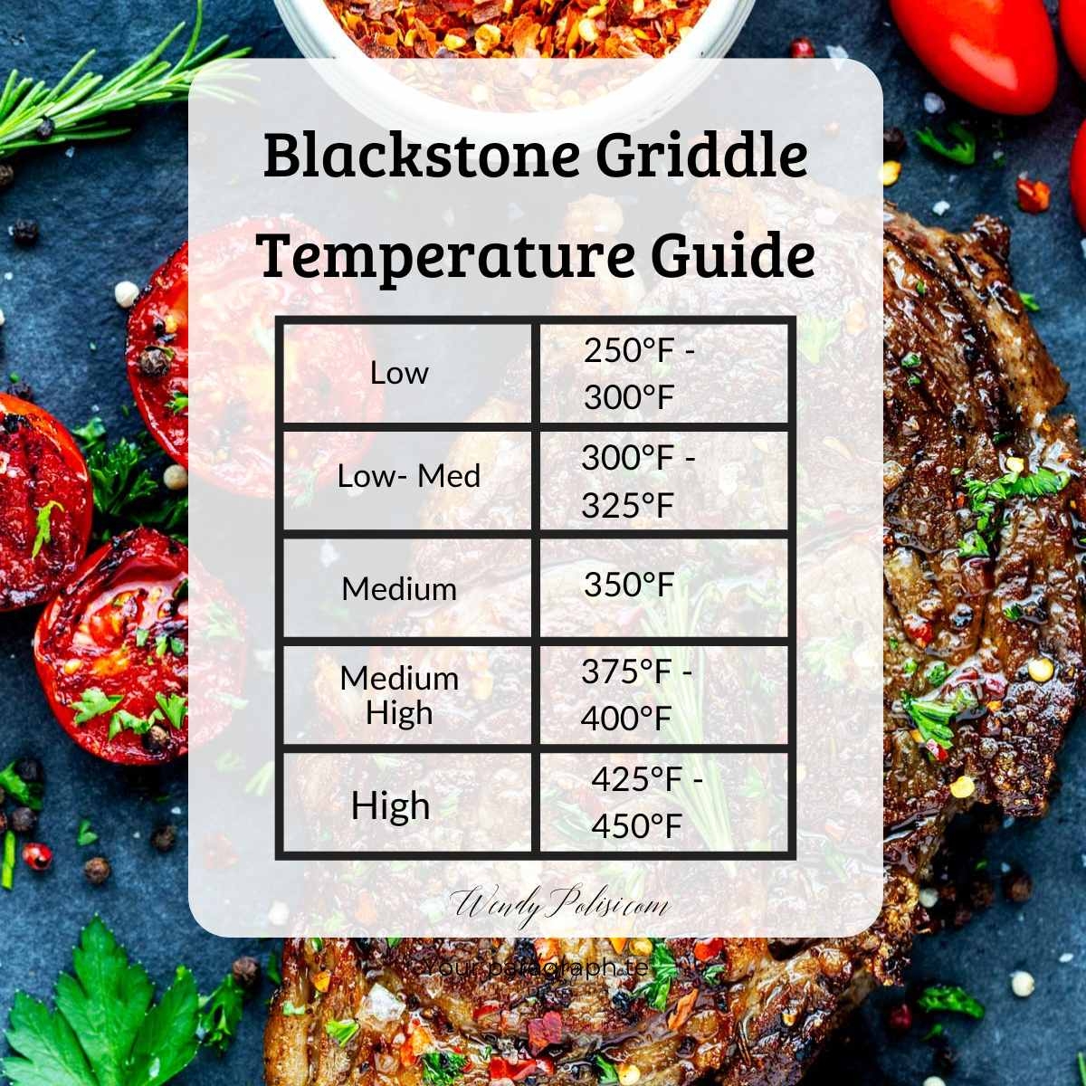 With our easy-to-read chart, you’ll know exactly when to sear, sauté, or simmer your favorite foods. From low heat for delicate foods like fish to high heat for a beautiful sear on your steaks, this chart has got you covered. Simply print it out and keep it handy for your next griddle cooking session.