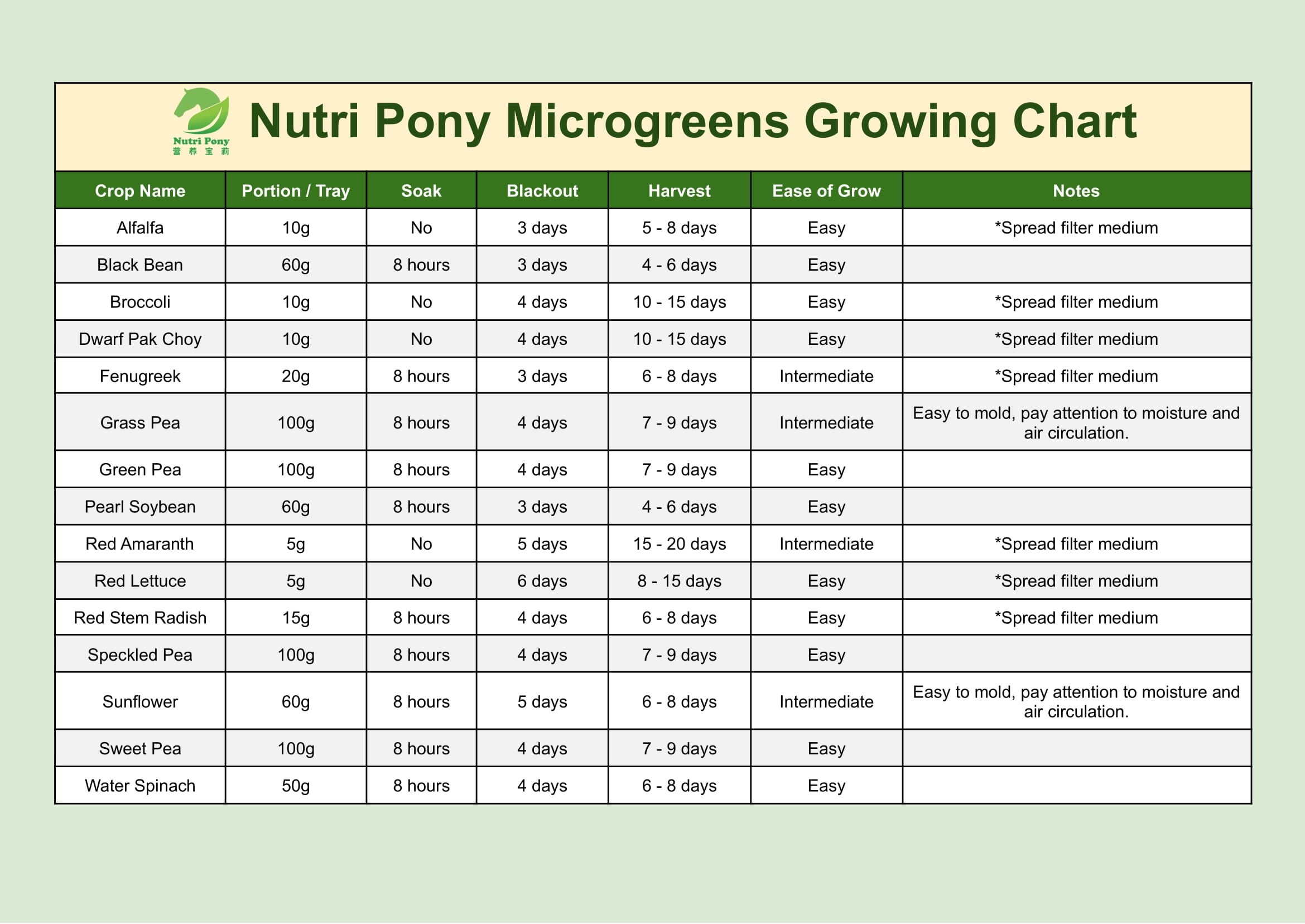 Microgreens Growing Chart