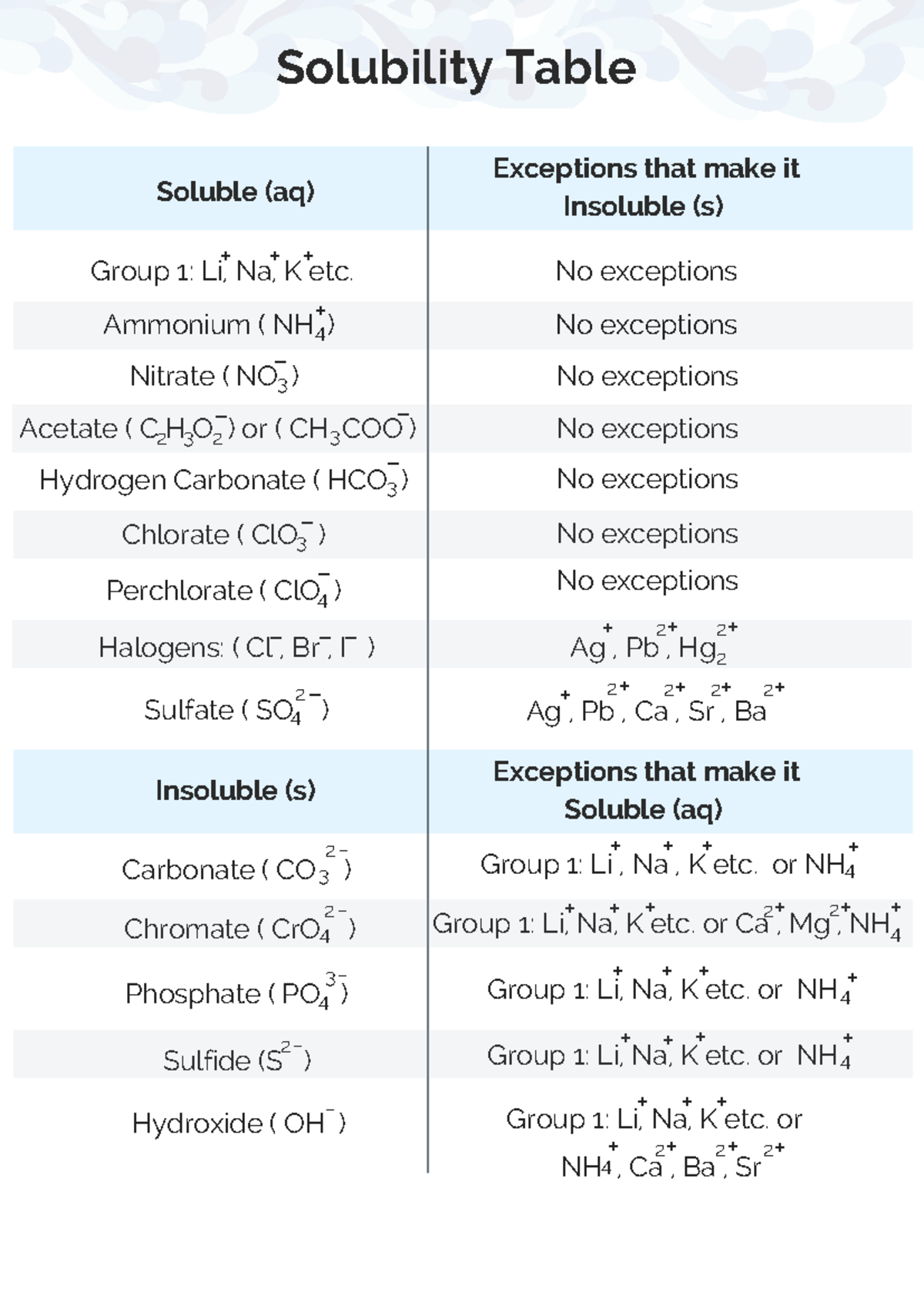 Solubility Rules Chart For Chemistry