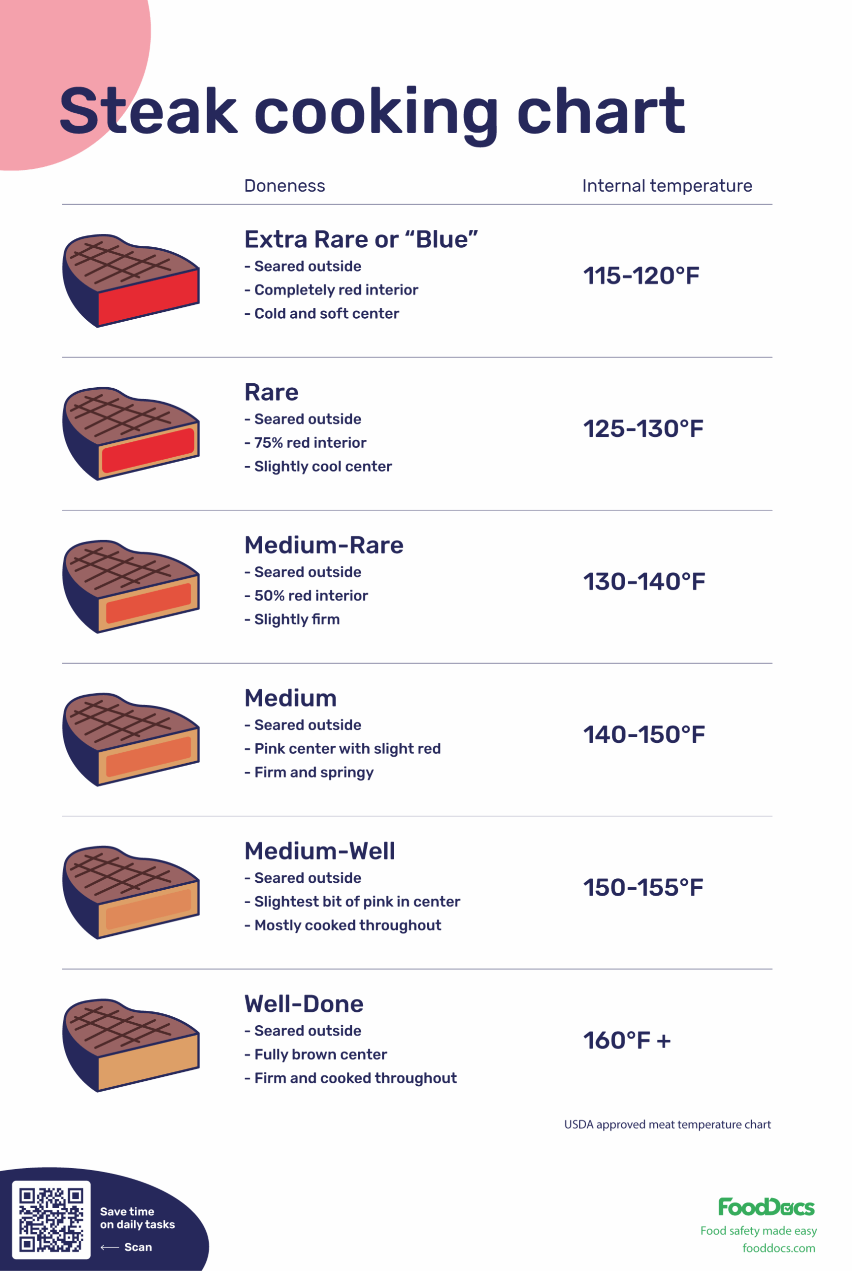 Whether you prefer your steak rare, medium-rare, medium, or well-done, this chart will ensure that you achieve the perfect level of doneness every time. Simply refer to the chart based on the type of steak you’re cooking and the desired level of doneness.